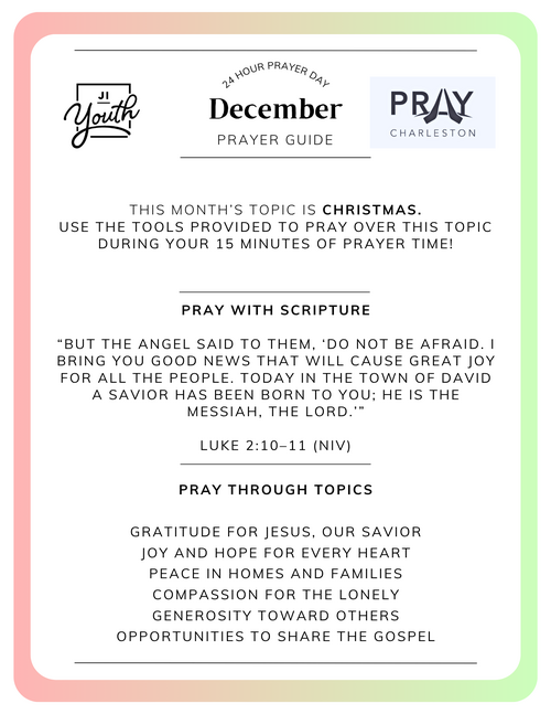 On the 10th of every month in 2025, we held a 24-hour day of prayer. This was in partnership with Pray Charleston as a citywide and global effort to unite the greater Christian church in prayer!