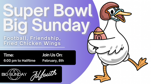 Join us for a laid-back and fun night at JI Youth’s Super Bowl Big Sunday! This Big Sunday event is open to all middle and high school students, and we’re keeping it simple and chill. We’ll watch the first half of the Super Bowl, eat fried chicken, and spend the night hanging out together.