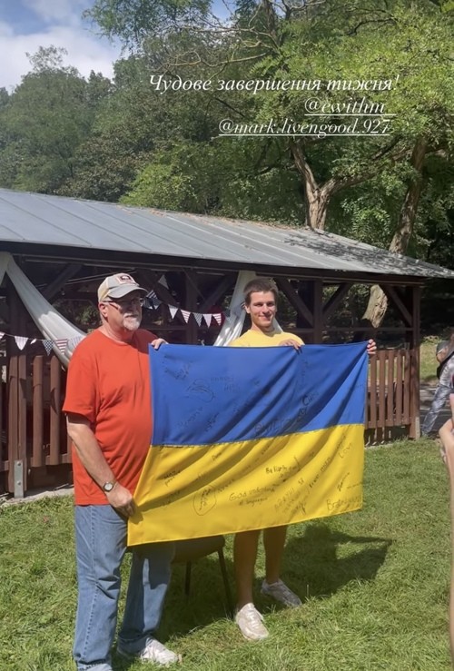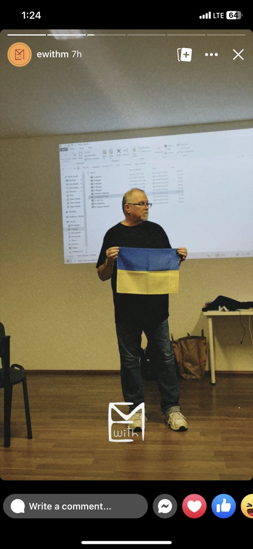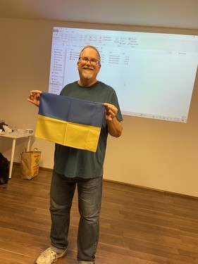 I brought in a Ukrainian flag. I said "God led me to Ukraine twenty years ago to teach English there. He blessed me with 17 trips. When I teach, I feel that God is pleased with me. God has given me a deep love for the Ukrainian people. I am so grateful to be here with you now."