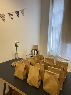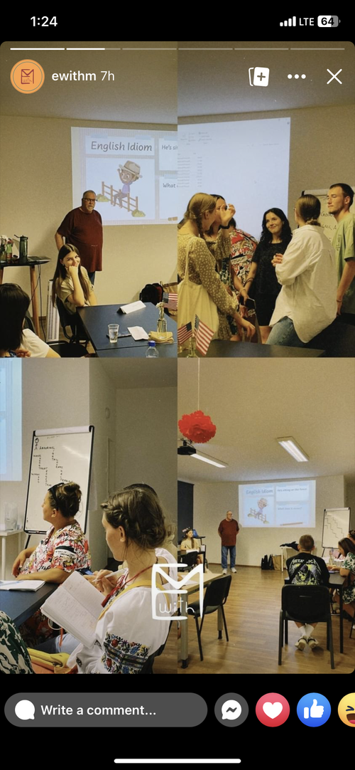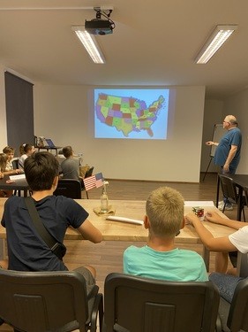 Today is Ukrainian flag day. Showing the students the US map. Snack time! The lessons are going so well. I can feel everyone's prayers. Don't stop! Thank you!